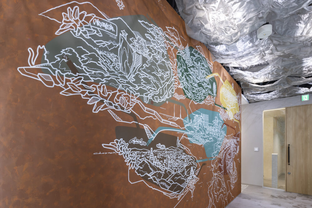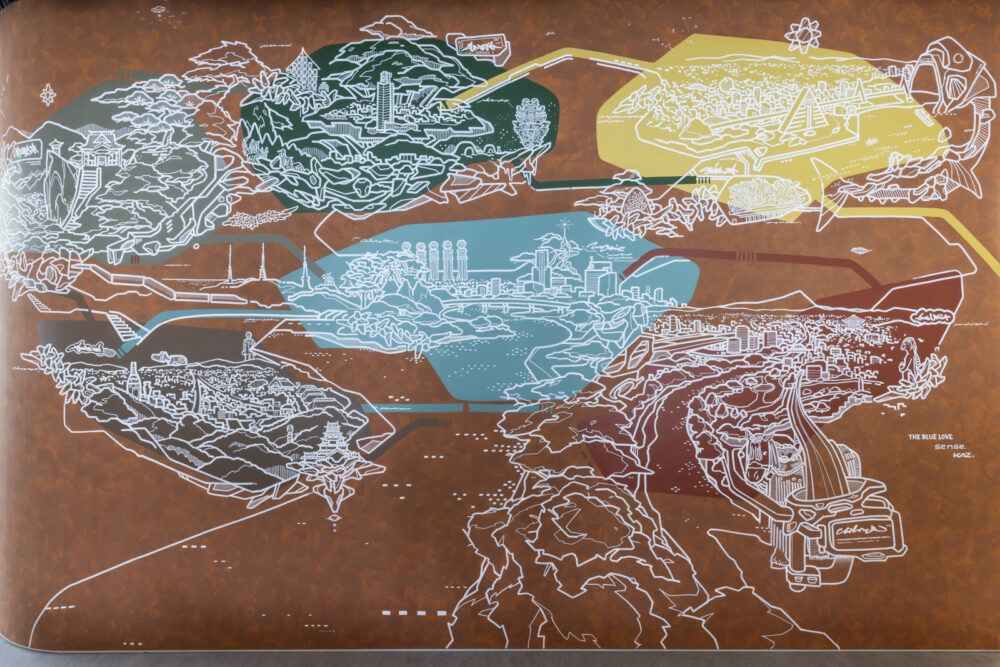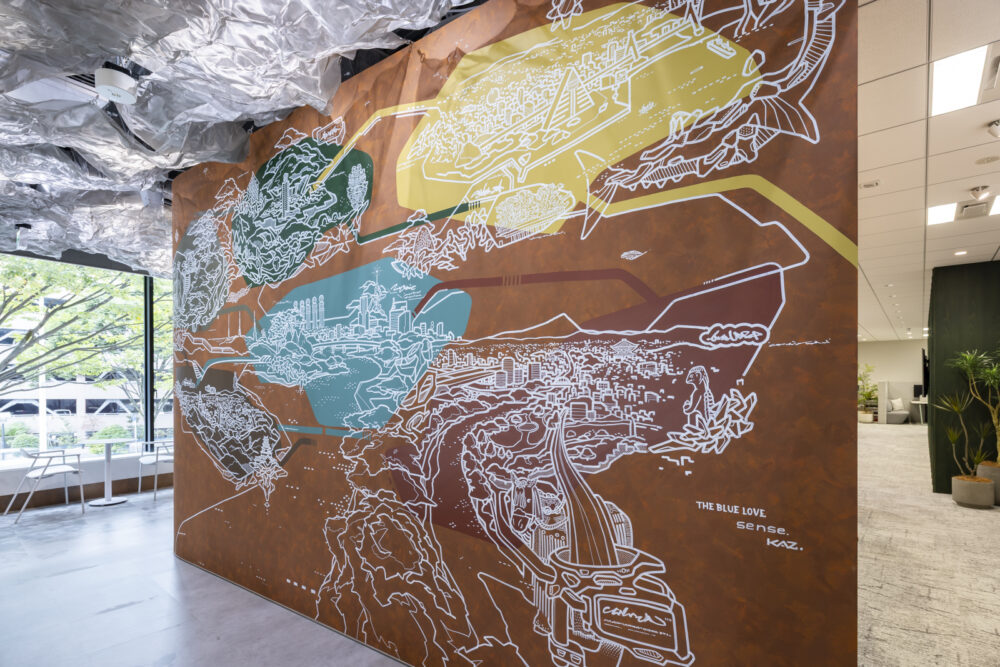 アートプレイスはアーティストユニットのsenseとKAZと協働し、壁面に東北6県を結ぶHUBとしての新オフィスを象徴する作品を展開した。東北6県(宮城・秋田・青森・岩手・福島・山形)の特徴やモチーフに関して、事前にオフィスリニュアル担当者とアーティストとのコミュニケーションの場をつくり、「未来に残したい建造物や伝統行事(祭り)」をテーマとして各県の特色を割り出していった。細密に描かれた線画には、世界遺産や地元独特の伝統工芸や祭りや、近未来を思わせる東北の都市と自然とが融合した景観・共生を一つの世界観として抽象的に描き出し、見るたびに新たな発見と対話が生まれるきっかけとなる作品を目指した。6つの都市・街・自然が調和して未来へとつながり、背景となる壁面カラーを作品に取り込んだ一体感のある作品に仕上げた