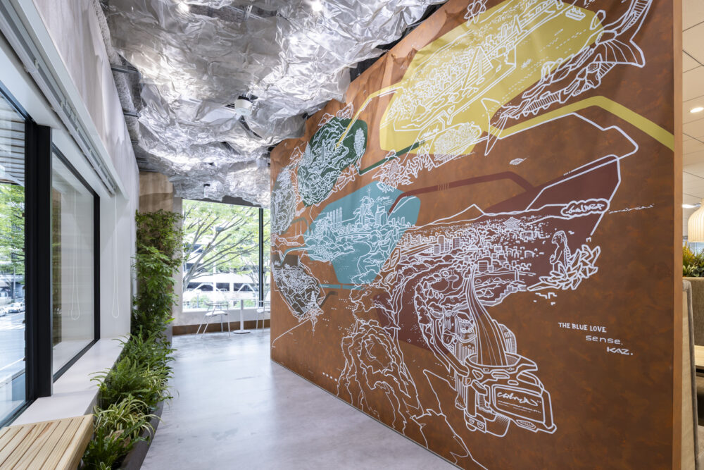 本作は東北6県のハブとなる仙台オフィスに、6県がひとつの世界になるようなイメージを構築し、自然と街の共生を感じられる作品を描いた。ワーカーと各県の特徴的なモチーフをディスカッションし、6県の未来に残したい歴史的建造物や、伝統行事(祭り)など、各県の特徴を味わいのある絶妙な表現で描き、見る人びとが地元への愛着心や新たな発見などを通して、互いに会話が弾むようなきっかけを作り出した。