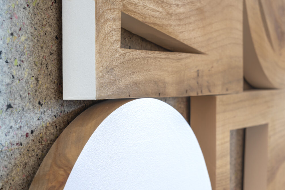 丸と四角というシンプルな形を組み合わせて構成されている《Costumbre》はスペイン語で「習慣」という意味を持つ。青木がメキシコ滞在時、常に現金の小銭が必要となった経験から生まれ、その場所によって起こる日常の変化や習慣を、「丸」と「四角」というコインとお札の形をモチーフとして作品化した。2021年以降、形や素材をその場に合わせて制作したシリーズであり、社会的な習慣の中にある様々な変化を感じとるために、性格の異なるいくつかの形を組み合わせてひとつの作品にしている。今回、4つの形で構成されたこの彫刻は、丸と四角、塞がれた形とくり抜かれた形などの対照的な要素の組み合わせによって、形がもつリズムを空間に投げかけている。本作はイトーキのリニューアル空間に向けた新作となる。