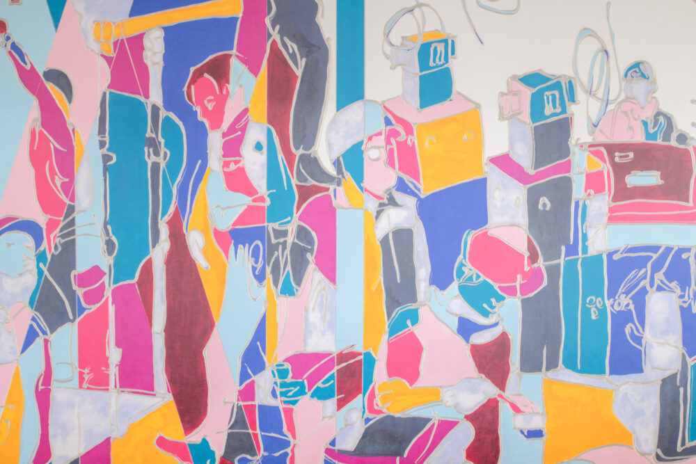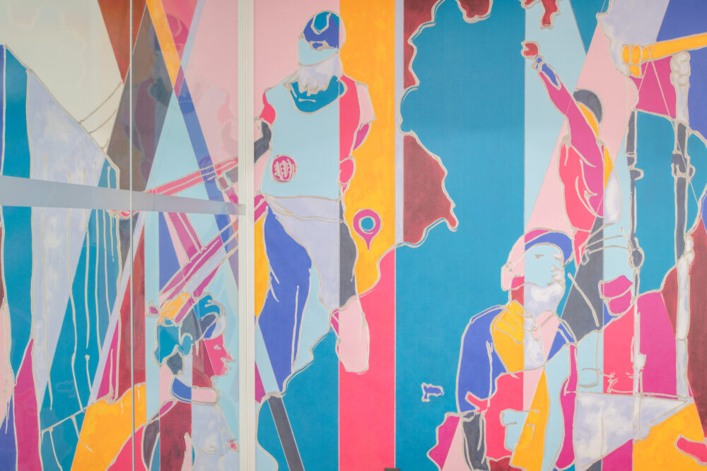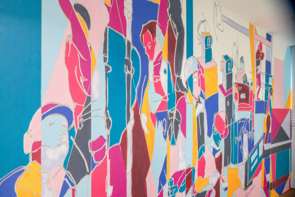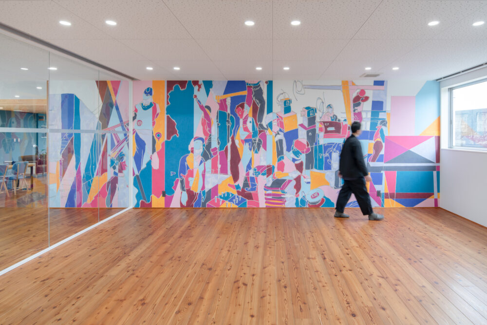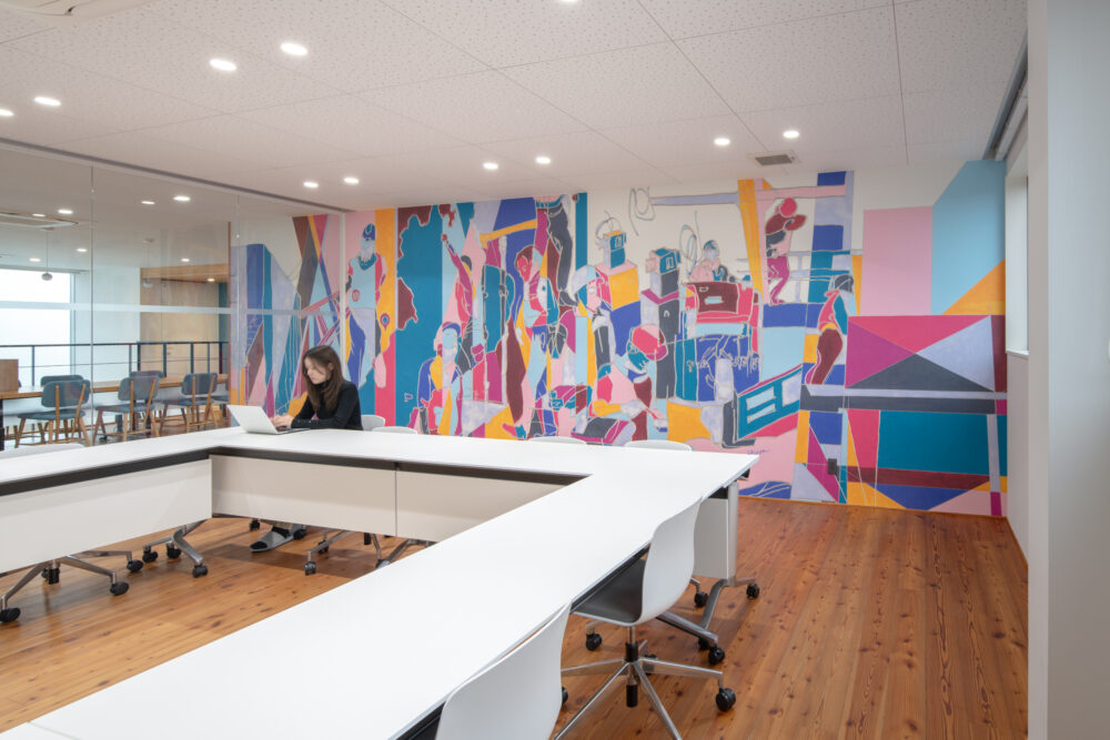 完成した作品は、ビビットな暖色系をアクセントにした色構成の中にコーポレートカラーを盛り込み、木造・非木造・鉄筋それぞれの構造的要素を抽象的に再構成。作品全体を通して、本社にいながら現場の空気感や働く人びとの息づかいを感じられる表現となっている。
