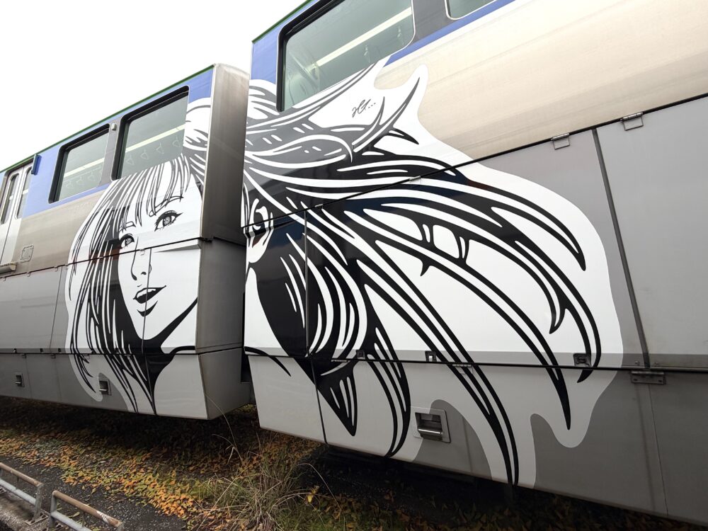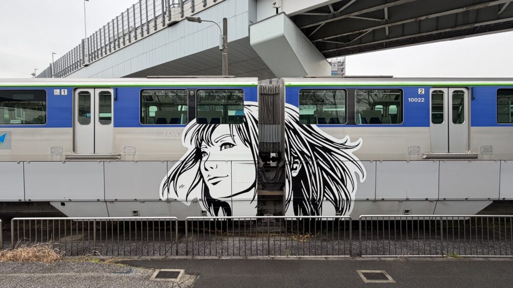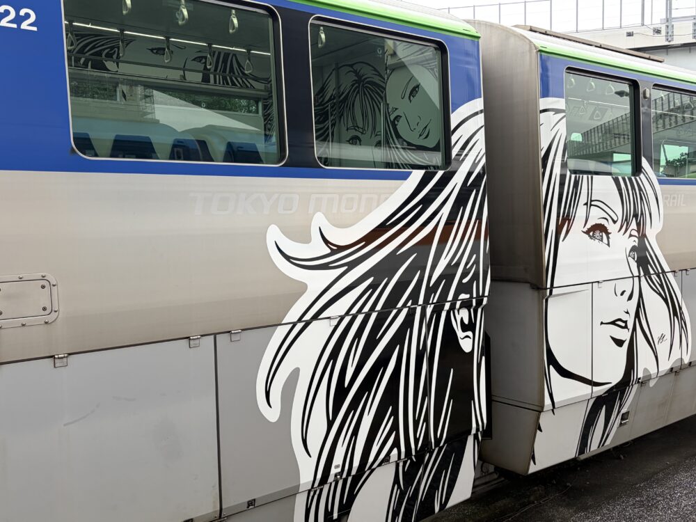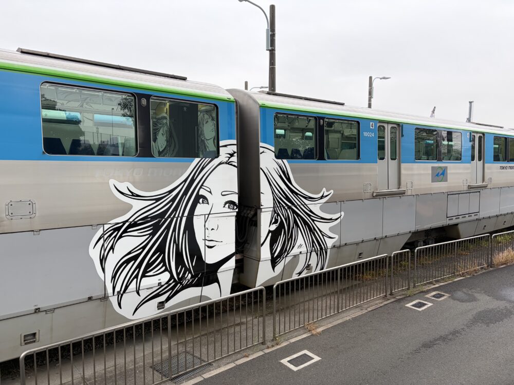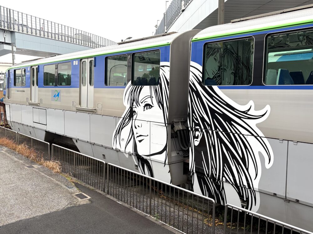 日本と海外を結ぶ国際線との架け橋であるこの10000形のモノレールはグリーンとスカイブルーの組み合わせで沿線の象徴である「空・海・緑」を表現している。その車両色に対しモノクロで描かれた3人の女性像は、貼られたステッカーやシールと呼ぶには巨大であり、輪郭線で表現する浮世絵や漫画といった「和」を意識させる。