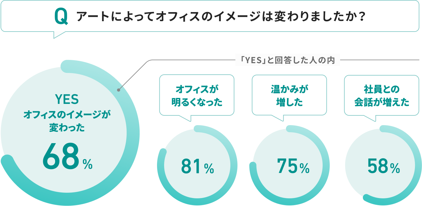 実際にオフィスアートを導入したオフィスで 働く社員の方にアンケート調査を行いました。 68%の人が「アートによってオフィスのイメージが変わった」と回答しています。